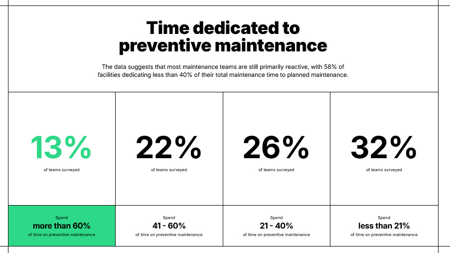 Несмотря на бодрые реляции о применении предупредительных стратегий технического обслуживания, данные показывают, что большинство команд по техническому обслуживанию по-прежнему в основном практикует реактивное обслуживание, причем 58% организаций отводят на плановое техническое обслуживание менее 40% совокупного времени технического обслуживания.